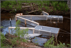 During pheromone field trials, one trap is baited with the synthesized pheromone. Researchers observe lamprey behavior downstream - and near the opening of - each trap and record the number of animals in each trap to determine if the baited trap is more effective at capturing lampreys. PHOTO: T. LAWRENCE, GLFC